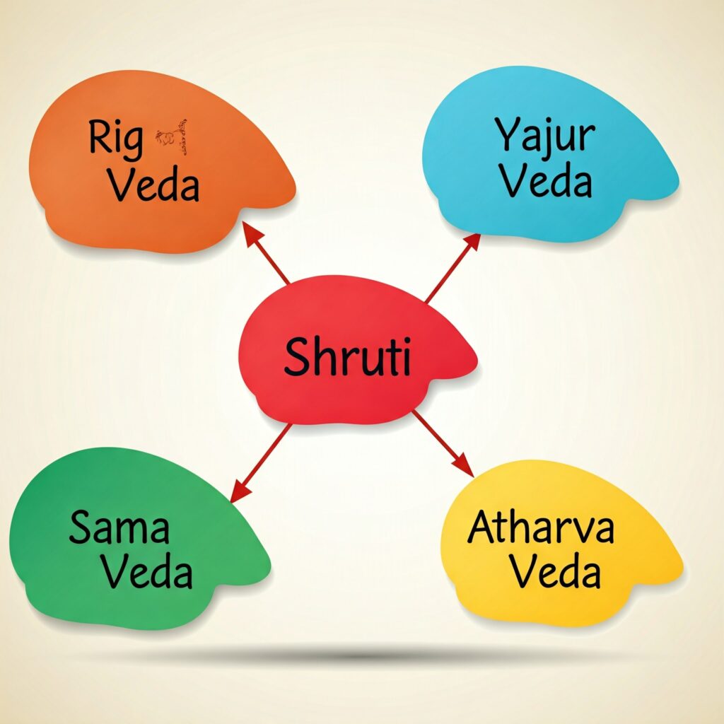 - Shruti: “What is heard” – divine revelations, includes the Vedas.